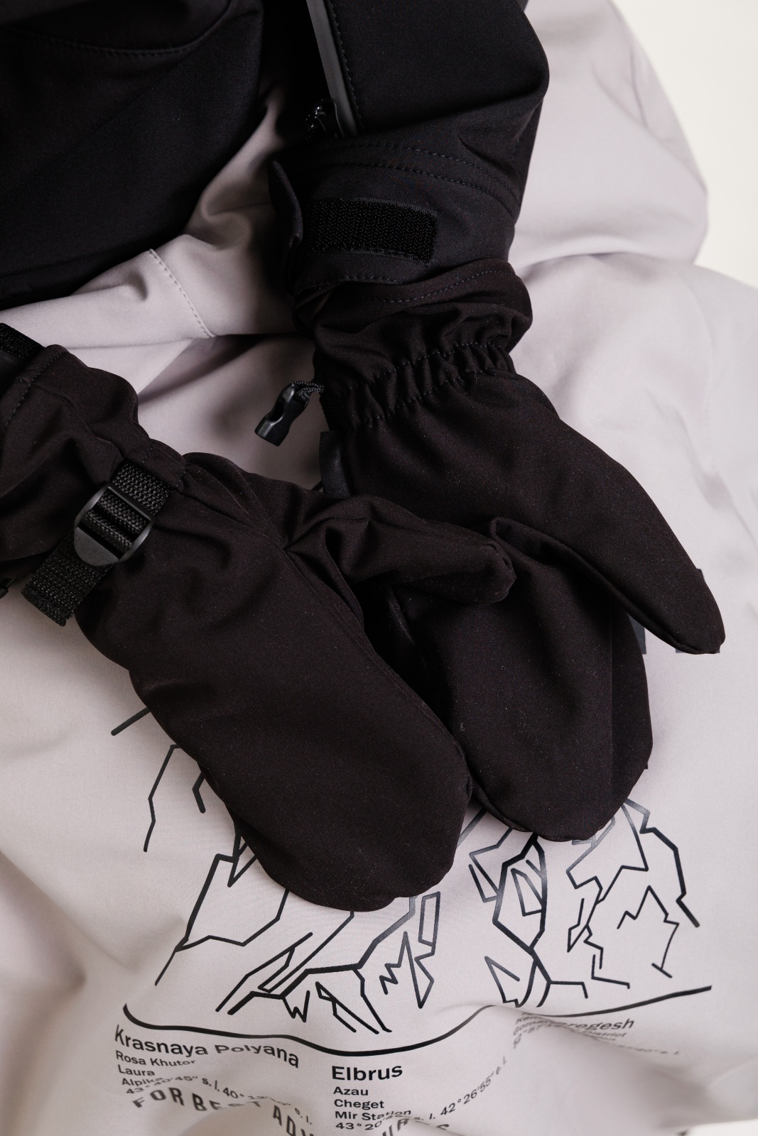 • Резинка и стропа на запястье: препятствуют попаданию снега внутрь варежек, обеспечивая дополнительную защиту.
