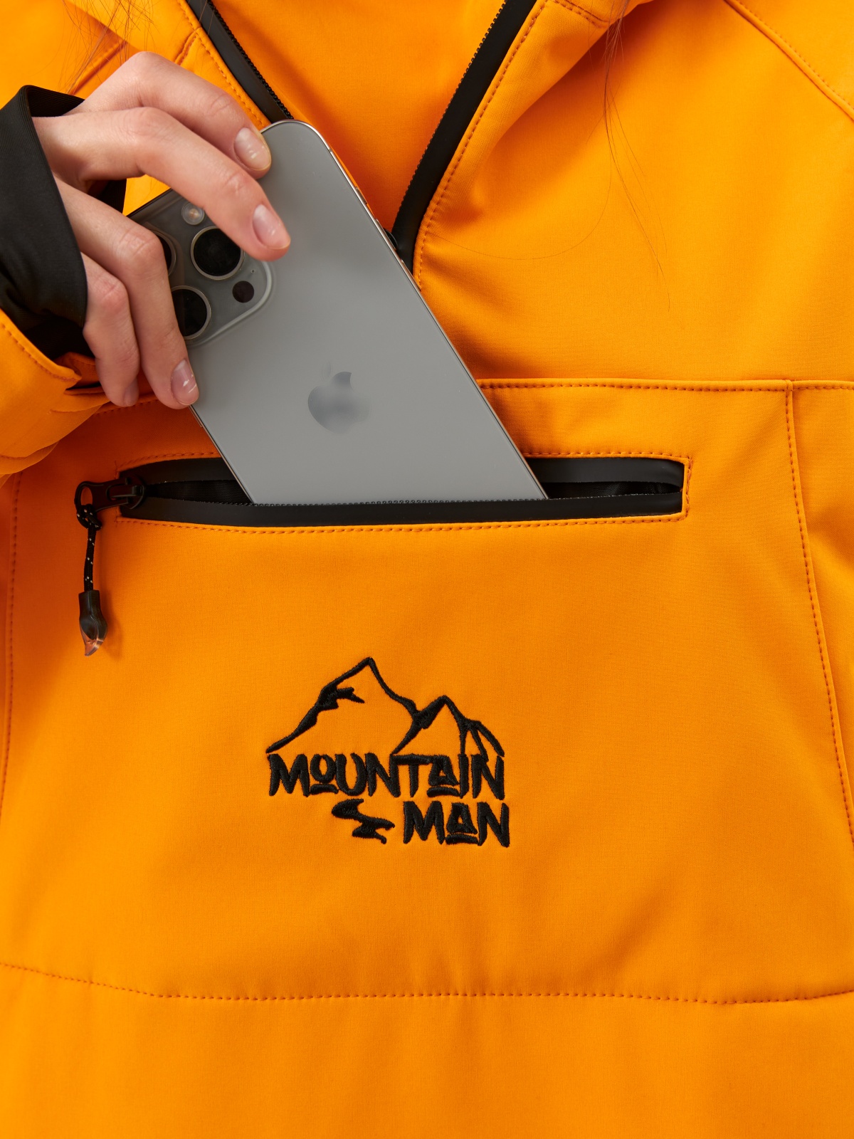 - Карман на рукаве для ski-pass, нагрудный карман для мелочей и вместительный карман-кенгуру — все на влагозащитных молниях.